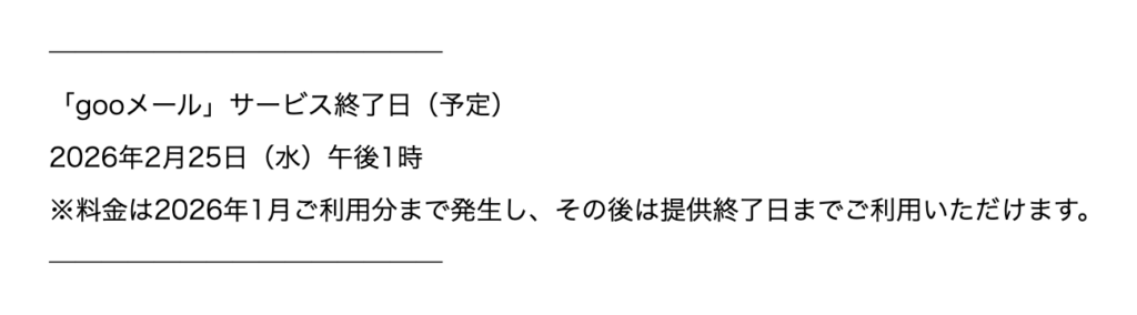 実際に、長年使われてきたメール関連サービスでも、終了や大きな変更が告知されています。たとえば gooメールは提供終了予定が案内されています。
