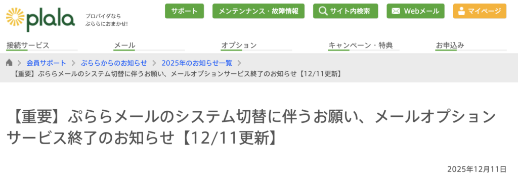 また、ぷららでもメール周りのシステム切替や一部サービス提供終了がすでに告知され実行済みです。